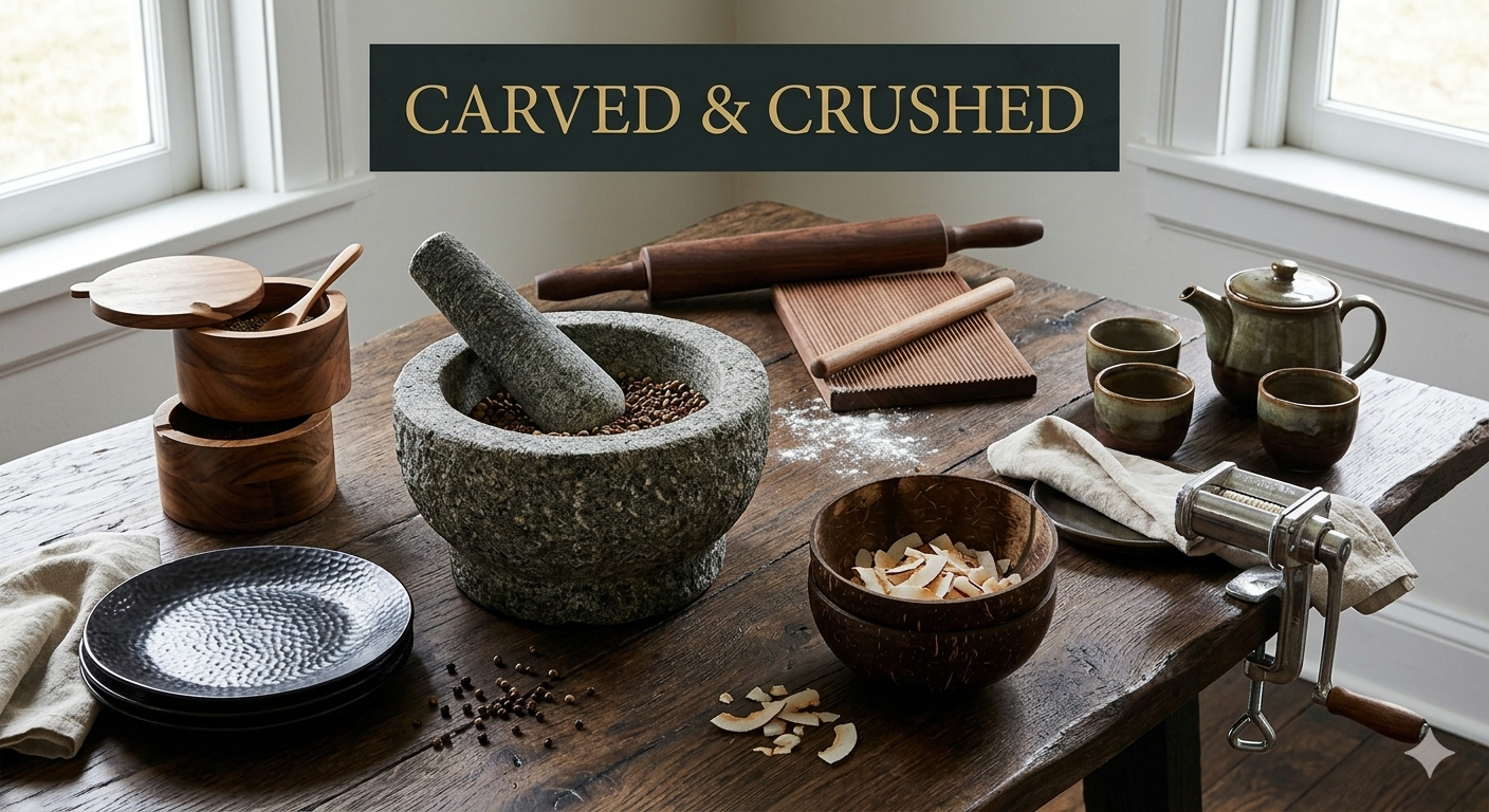 Heavy stone, raw wood, and traditional craftsmanship for the modern kitchen