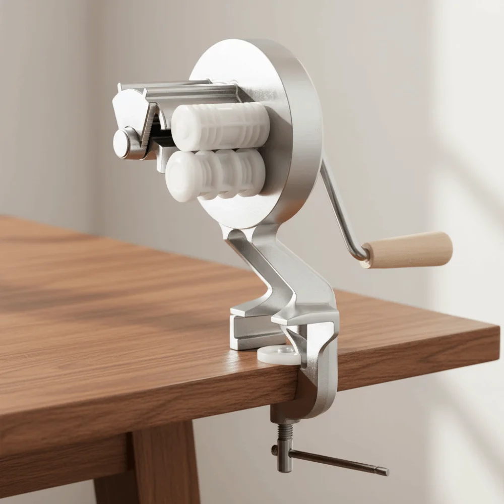 • Secured Workspace: Features a powerful, built-in vacuum base or clamp that locks onto your countertop, providing the stability needed for high-volume pasta making.